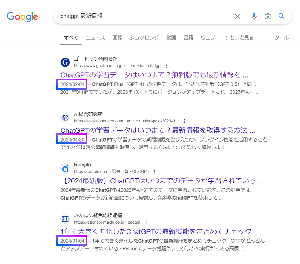 例えば、「chatgpt 最新情報」の検索結果をみてください。